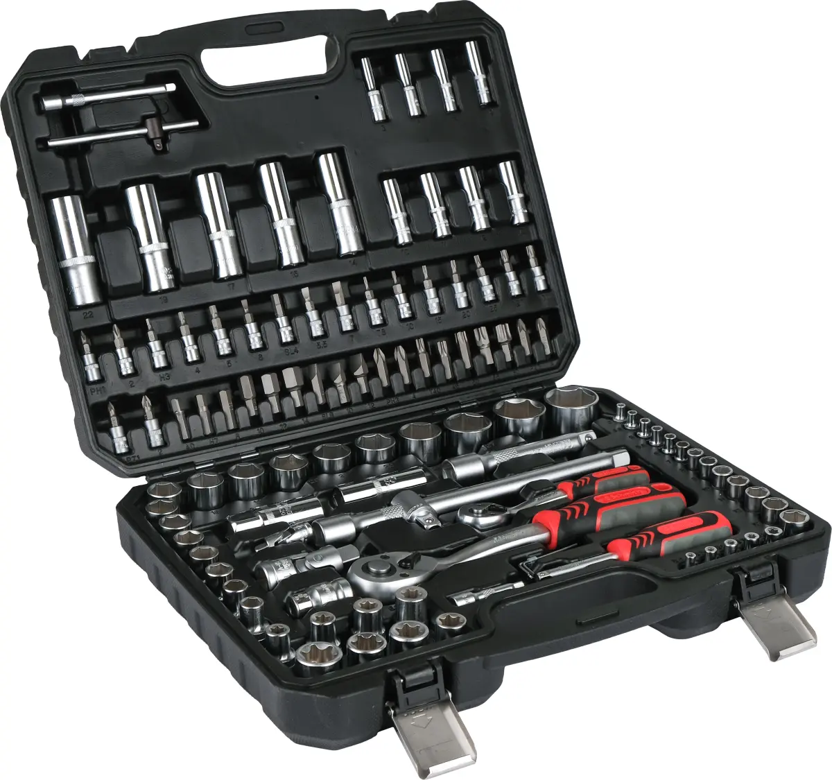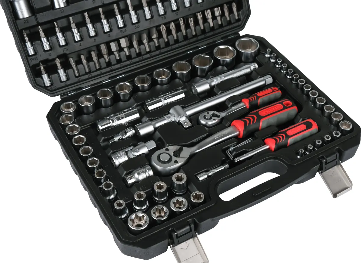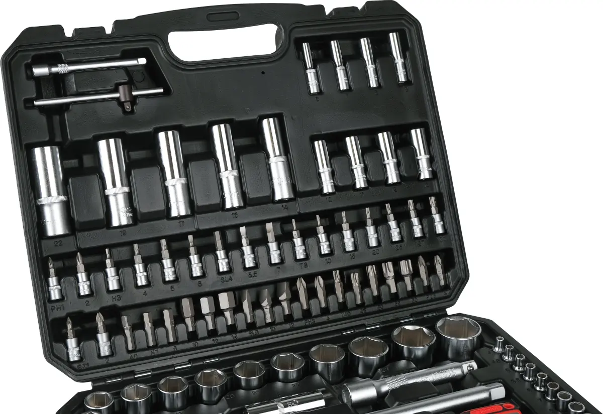 Zestaw narzędzi został zaprojektowany do szerokiego zakresu zastosowań technicznych. Połączenie dwóch rozmiarów grzechotek 1/4″ oraz 1/2″ wraz z bogatym zestawem nasadek i akcesoriów umożliwia wygodną pracę przy różnych typach połączeń śrubowych. Solidne wykonanie zapewnia trwałość, precyzję oraz komfort użytkowania.