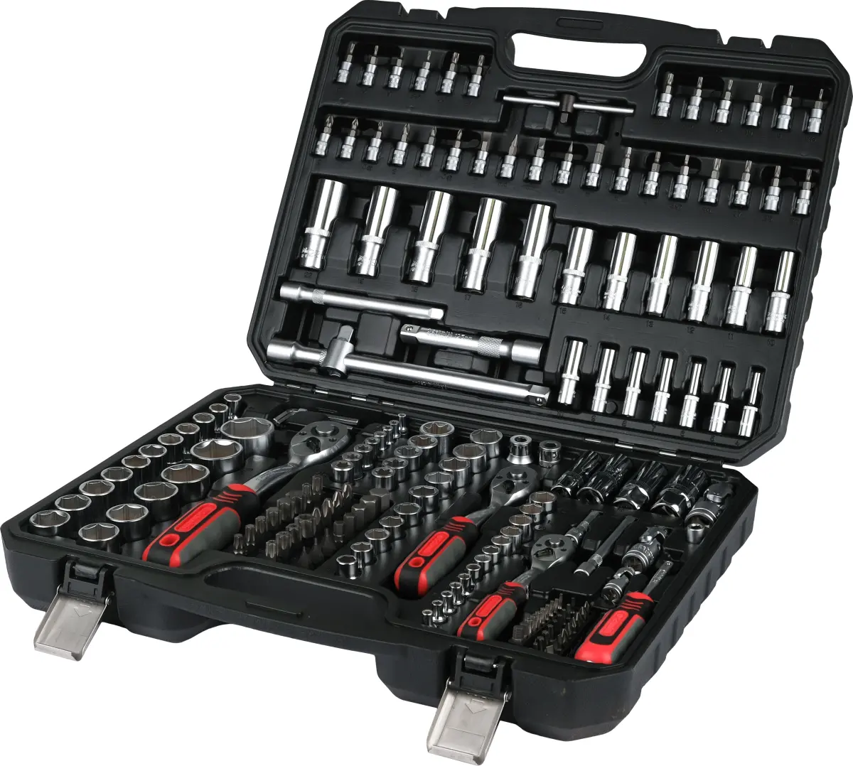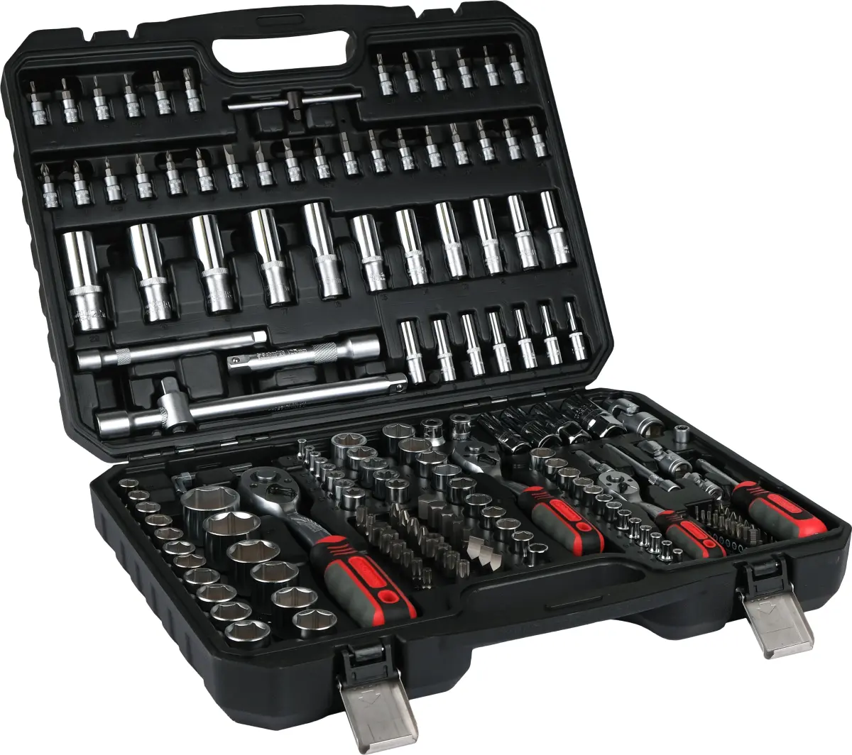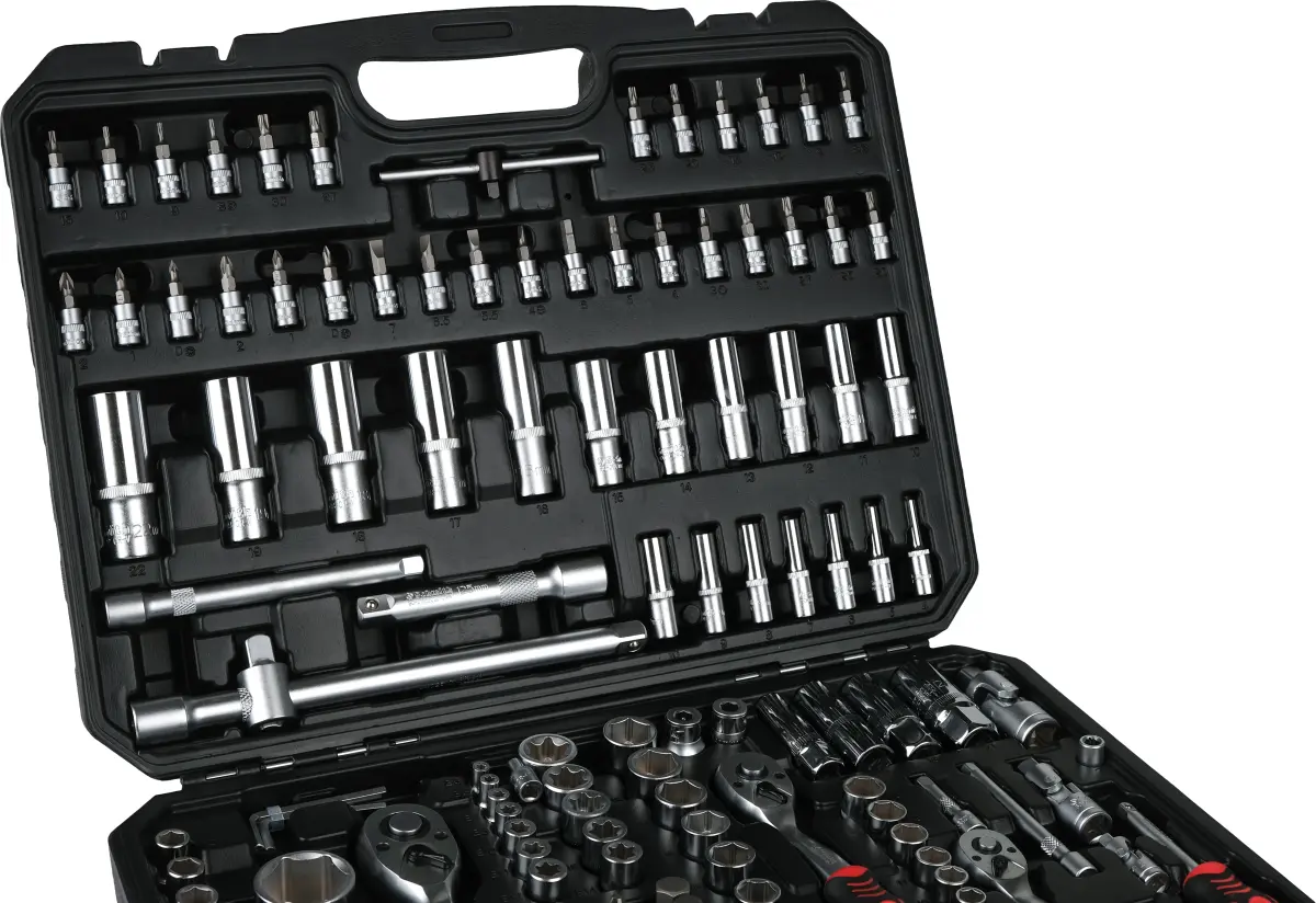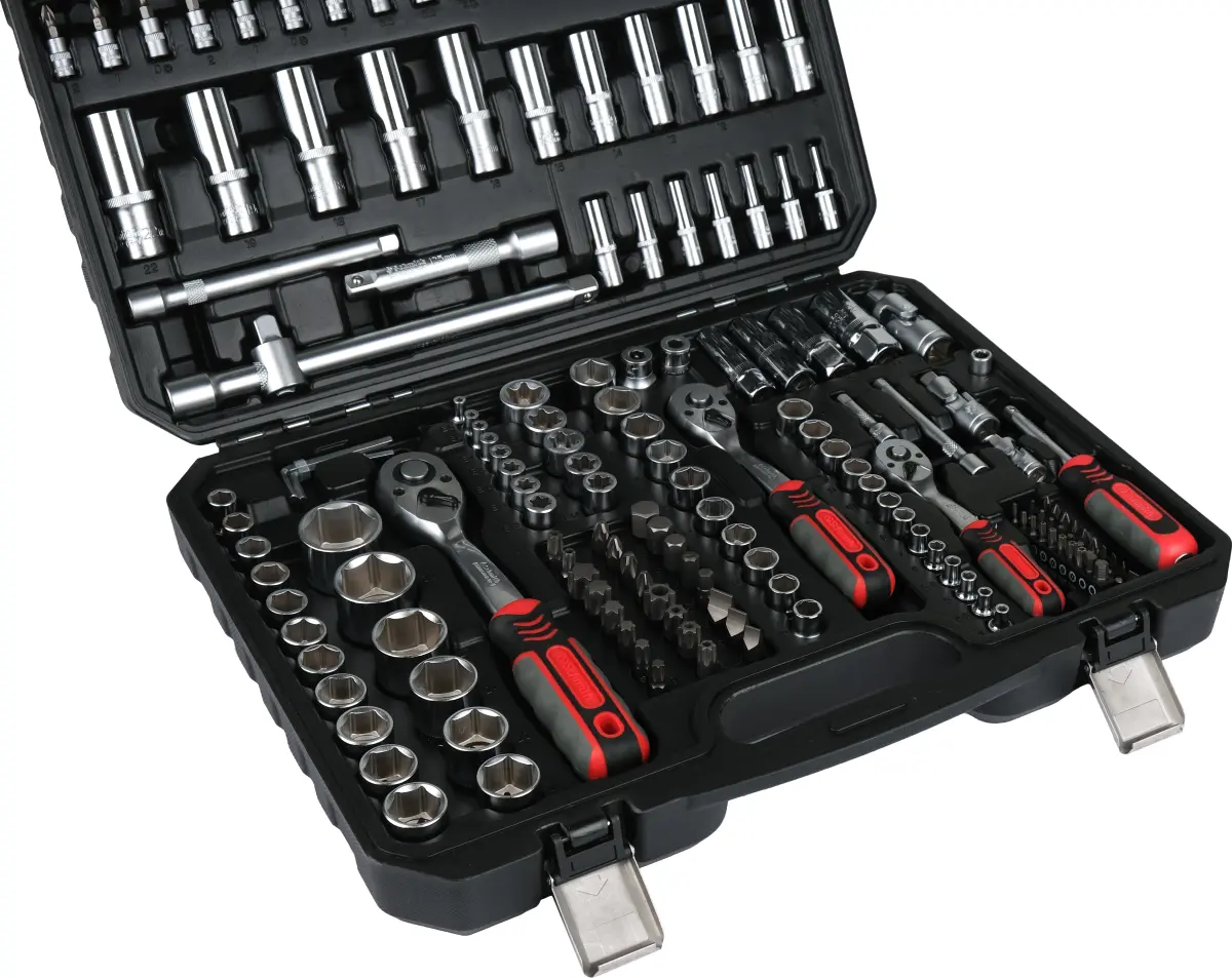 Zestaw narzędzi został zaprojektowany do bardzo szerokiego zakresu zastosowań technicznych. Trzy rozmiary grzechotek (1/4″, 3/8″ i 1/2″) oraz bogaty komplet nasadek i akcesoriów umożliwiają pracę przy różnych typach połączeń śrubowych. Solidne wykonanie zapewnia trwałość, precyzję oraz wygodę użytkowania zarówno w zastosowaniach profesjonalnych, jak i domowych.