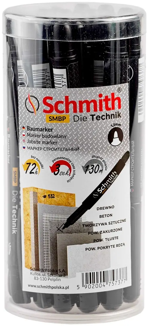 Marker budowlany Schmith SMBP — niezawodne narzędzie do wyraźnego znakowania na placu budowy. Przeznaczony do pracy w trudnych warunkach, zapewnia długotrwały, kontrastowy ślad nawet na wilgotnych i zanieczyszczonych powierzchniach. Ergonomiczna obudowa ułatwia pewny chwyt i precyzyjne prowadzenie linii, a solidna końcówka gwarantuje równomierne nanoszenie materiału.