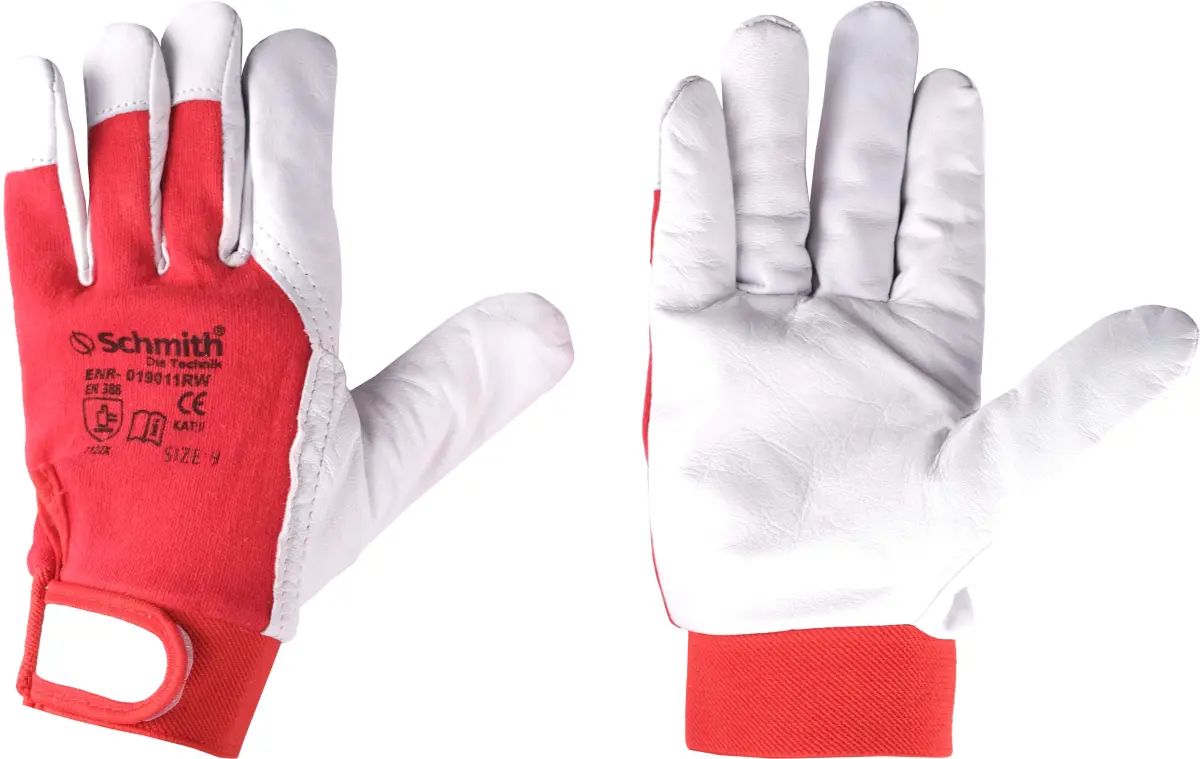 Przedmiotem sprzedaży są rękawice robocze skórzane marki Schmith w rozmiarze 9, wyposażone w zapięcie na rzep, model SRSK-9R.
