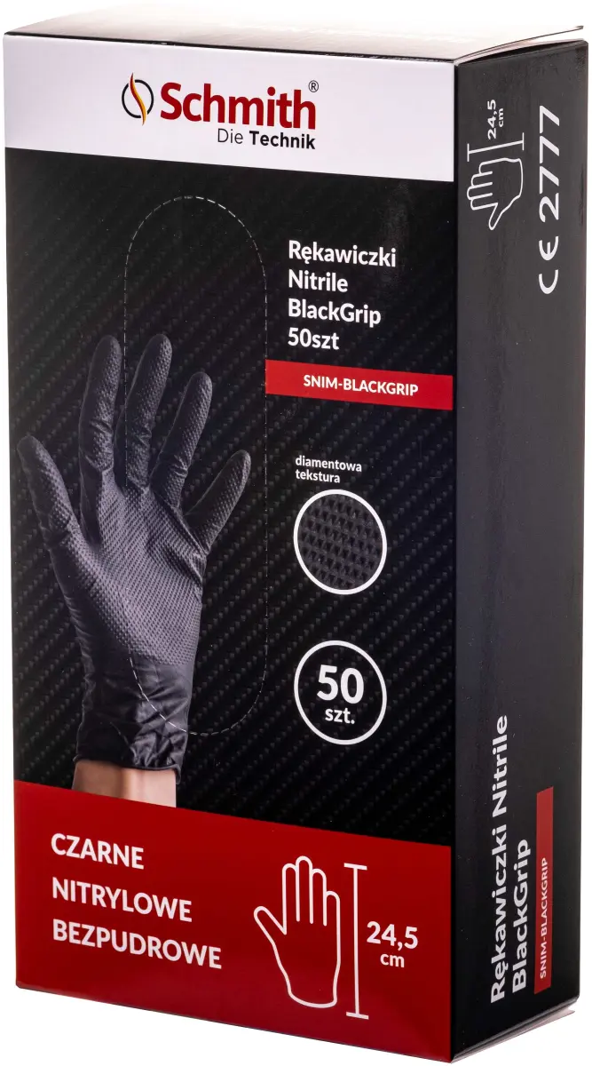 Przedmiotem sprzedaży są rękawiczki nitrylowe marki Schmith, model BlackGrip, w rozmiarze L, opakowanie 50 szt., przeznaczone do prac ochronnych i technicznych.