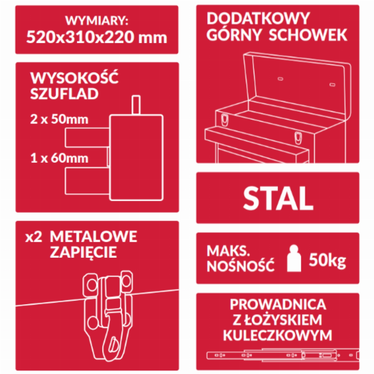 Skrzynka narzędziowa została zaprojektowana z myślą o wygodnym przechowywaniu narzędzi oraz drobnych akcesoriów warsztatowych. Trzy pojemne szuflady umożliwiają uporządkowanie wyposażenia i szybki dostęp do potrzebnych elementów. Solidna konstrukcja zapewnia trwałość oraz stabilność podczas użytkowania w warsztacie lub garażu.