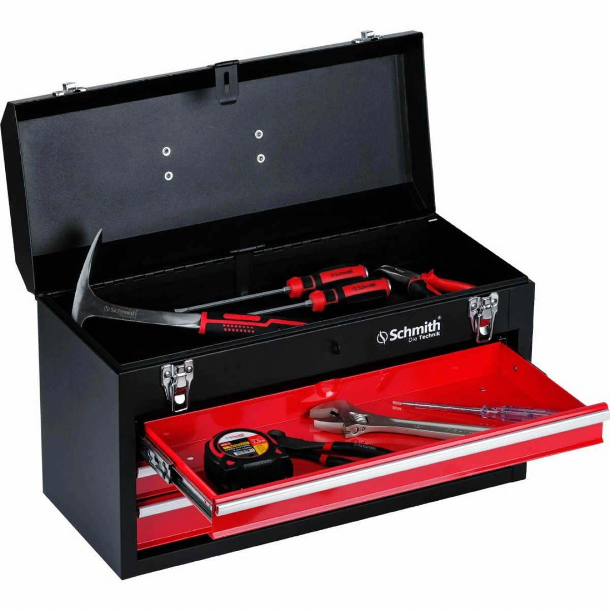 Przedmiotem sprzedaży jest skrzynka narzędziowa marki Schmith, model SCH02B01010, wyposażona w 3 szuflady, przeznaczona do przechowywania i organizacji narzędzi.